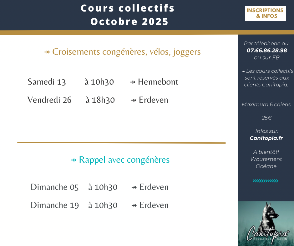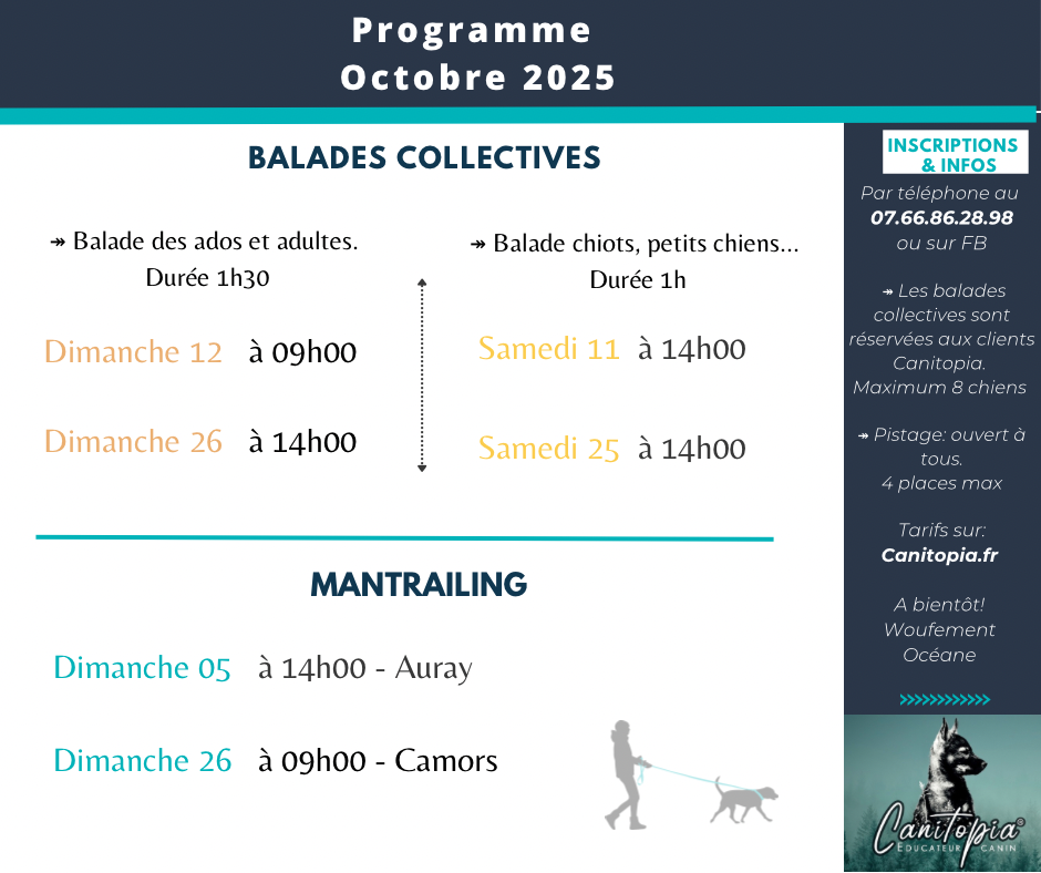 Retrouvez, tous les mois, l’agenda des cours et balades organisés par Canitopia. Ces dates sont également disponibles sur Facebook et Instagram. Toutes les activités se font sur inscription et les places sont limitées. Les balades collectives sont réservées aux clients Canitopia. Si ce n’est pas le cas, je vous invite à me contacter pour prévoir un bilan comportemental au préalable ainsi que des cours de bases.